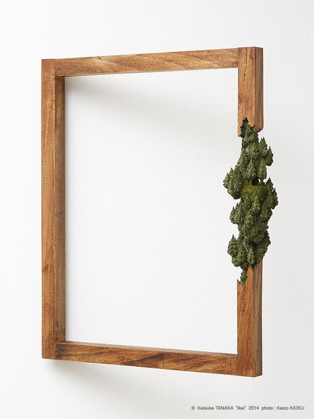田中圭介運用廢棄的木頭,精細雕刻出山林樹木、雲朵,以及水的形體,並塗上顏料。將木框中油然而生的山水風景,給予新生命,並似乎也是要提醒我們這些木頭從何而來。