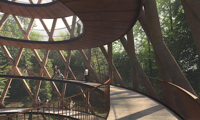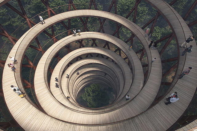 蜿蜒的螺旋觀景塔依照建築的穩定性考量,相對於中段,底部和頂部較寬的設計,形成了塔有腰身的有趣景象。塔身也是由兼具防腐蝕、結構支撐功能的耐候鋼所建構而成,步道表面的木材則出自於森林內,整體外觀與周圍環境自然地融為一體,就像是從地裡長出的大藤樹!螺旋式的步道讓遊客們沿著緩坡盤旋而上,有不同視野的漸變體驗,拓寬的塔頂觀景平台,讓登頂的遊客們能更親近森林的樹冠層生態。