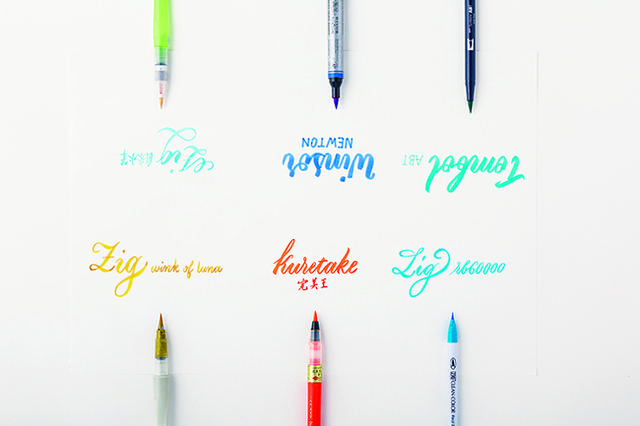 Brush pen 指的是軟筆刷,造型就像寫漢字書法的毛筆(圓頭軟筆),工具差異在筆頭構造、需沾墨、自動出墨、筆毛長短、顏色。下文中會詳細介紹各種筆款特色與使用心得。
