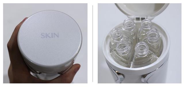 從外觀上護膚用品和沐浴用品的差別除了最萌身高差以外,從瓶蓋上也可以辨認,看到寫著 SKIN 就是護膚用品收納瓶囉,往上掀開瓶蓋可看到 6 支各容量 30ml 的按壓瓶。