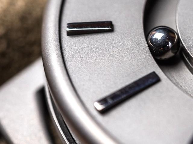 上方的鋼珠是傳統手錶中的「分針」,而側邊的則是「時針」,剛開始接觸或許會有一點點不習慣,但在辨識上沒有任何學習難度,僅需多配戴一些時日便可以直覺的判斷出當下的時間,即使是在黑暗的環境下也沒有任何阻礙。