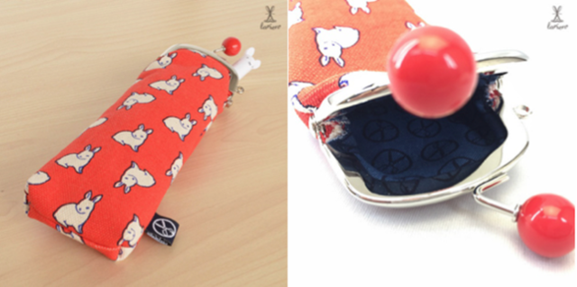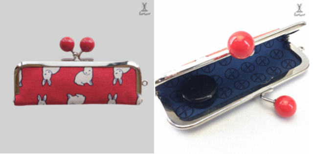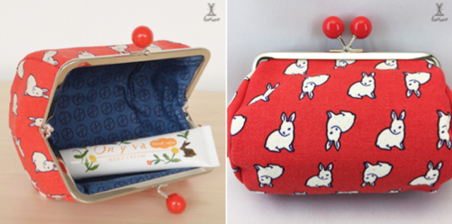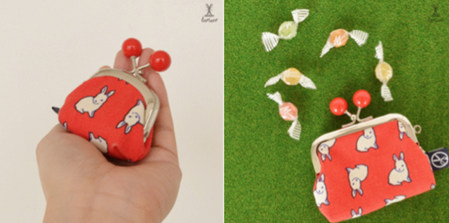 近幾年日本的雙珠扣式復古包款相當流行,當初零錢包會這樣設計是因為打開時就像蟾蜍張開嘴一樣,可以招來財運,且當時歐洲的貴婦也會帶著這類的包款參加舞會,不論便利性、美觀性及優雅程度,皆佔有很大的優勢。而此款包款是由創業 55 年的日式帆布店-五色帆布堂所製作,顯色的紅色染料搭配上堅韌簡樸的兔子花樣帆布,讓人一眼就發現它的存在。