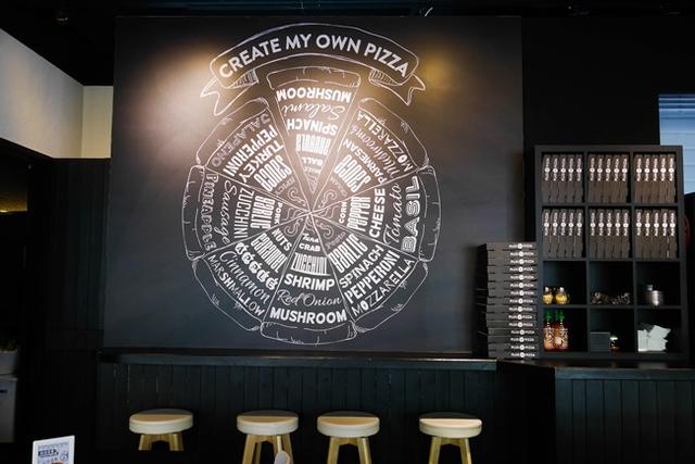 自選料的這個用餐方式,真的能避免掉平常吃披薩時遇到不喜歡的食材,還要刻意挑出的問題。在店員的熱心推薦下,最後我選擇了小麥餅皮,塗抹上奶油培根白醬,撒上雙色起司及牽絲的起司球,再添加新鮮食材:波菜、甜椒、蘑菇、黑橄欖、沙拉米、蝦仁及蟹肉絲。可以看到最後配好的披薩上面有滿滿的配料,根本就是披薩山!這輩子還沒看過料加這麼浮誇的披薩。披薩還沒烘烤之前,手機就已經忍不住比我搶先吃了!