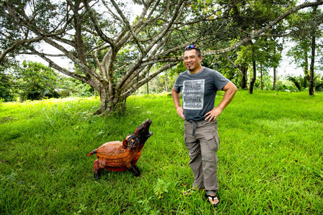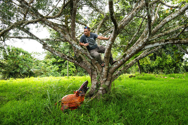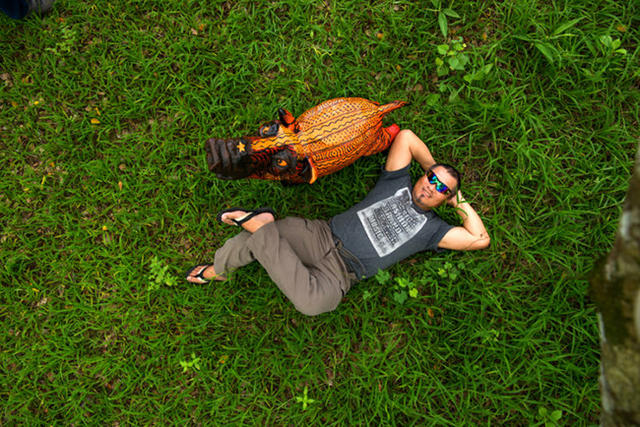 平躺的圖騰巨人使盡全力舉起手臂,支撐著末代祭司那瘦小的身軀。後方的 Amsolai(神域與俗域之間的鷹神)曾經是翱翔天際的神靈,卻被下了禁制,如今連在森林裡都無法展翅。往前的道路也遭到山豬群的阻擋,各個眼睛睜得圓大,好似在訴說著些那些快要被遺忘的故事。巴豪嵐・吉嵐記錄部落,透過雕塑講述消失的信仰、流失的文化⋯⋯