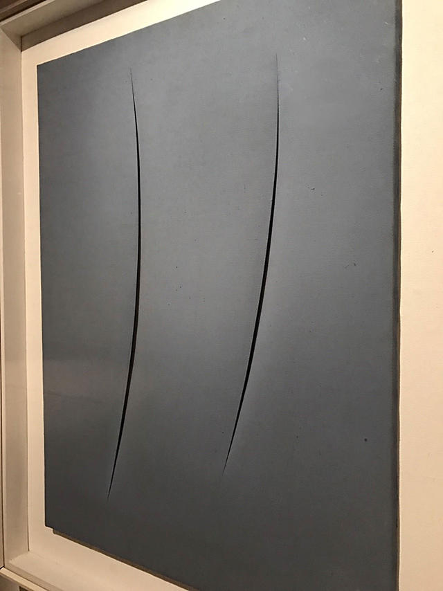 一進入二樓的展區,迎面而來馬上吸睛的,倒不是之後要提到的 Arman 那件色彩艷麗奔放、活潑生動的重複性立體雕塑「畫作」,而是這件尺幅不大,但名震天下的劃破畫布「空間概念」(Concetto Spaziale)系列。