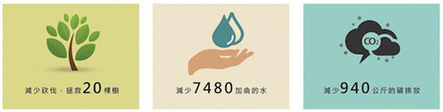 ◆ 製程完全不砍樹木、不用水、不排廢水、不排廢氣,過程能節省 7,480 加侖的純水、減少 900 公斤碳排放、少砍 20 棵樹。