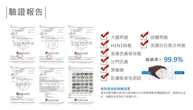 ELECLEAN 的檢驗報告表單,裡頭有我們都很熟的各種病菌,竟然連黑黴菌都有!不過光只有檢驗報告還不夠,所以我們特地借了專業器材來測量滅菌能力,務必親眼看到實驗結果才甘心!