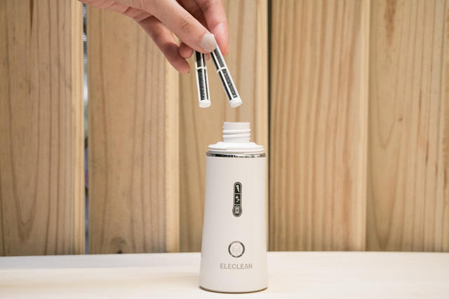 其中「活化晶球」是很特別的東西,它並不是添加物,而是協助反應的觸媒,因為日常中能取得的水有不少種,自來水、瓶裝礦泉水、煮開過的水、甚至地下水,為了因應各種水質來源,ELECLEAN 以這個「專利活化晶球」為媒介,輔助提高反應的效率,確保在各種水質下都能製作出具有足夠濃度的消毒噴霧。