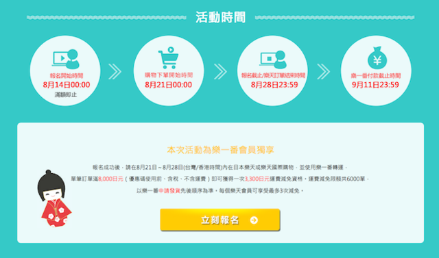 接下來的購物流程跟在臺灣購物網站消費沒有太大的差異,只要在結束挑選後,在結帳時輸入剛才向大家說明的樂一番收件資訊,就可以完成訂購程序。最後再幫大家複習一下這次優惠活動的活動參加的方式:樂一番的會員只要在這個頁面中按下立刻報名,活動期間於「日本樂天市場」單筆訂單滿8,000日圓(約新台幣2,200元),即可獲得3,300日圓(約新台幣910元)的運費減免資格,是個相當有感的優惠活動,不用再為額外的國際運費傷腦筋。而特別要注意的是,這個優惠是以「申請發貨」後才能獲得~