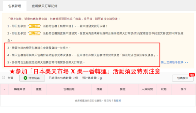 沒錯!在買完東西之後,日本樂天市場的店家會將商品寄到你專屬的集貨倉庫,收到入倉通知,你可以選擇立刻發貨,或者是多筆訂單合併發貨。在發貨前先到「包裹管理」裡頭詳細填寫商品類別、商品連結、售價、數量等資訊,如實申報並確認總金額,接著跟著步驟將所有資料填寫完成就能發貨拿到商品了!