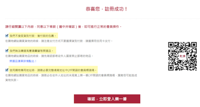 3. 使用購物專用地址時,請務必要完整填寫地址中LYF開頭的會員標示碼。
