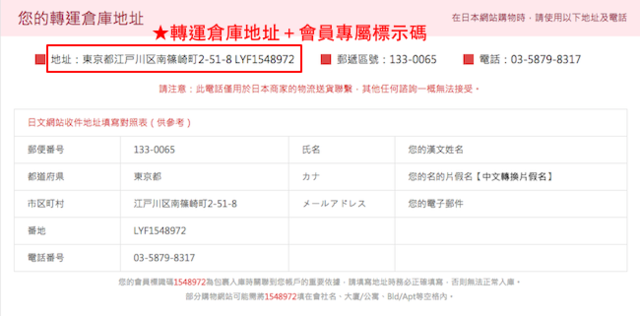 這三個條款特別標註出來,既是最基本也是最重要的原則,只是前面兩個容易理解,後面「LYF開頭的會員標示碼」是什麼呢?原來只要進到「我的帳戶」中便可以看到完整的轉運倉庫地址,以及會員專屬的標示碼,確實填寫才能夠幫助店家寄送到正確的倉儲空間中。