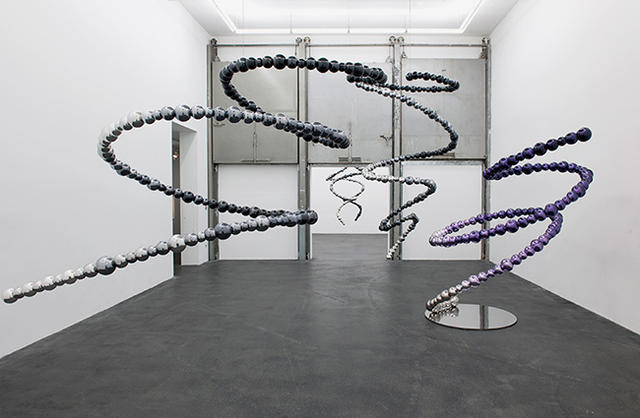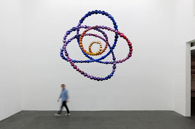 在另一邊展區,則是企圖反映自然元素的潛在力量,他用一顆顆鋼球串起龍捲風的強大威力,懸吊於半空中的呈現形式,讓人更有生動的感受;以彩色玻璃珠編織而成的「野生三色堇」,藝術家將巨大的蝴蝶結獻給思想自由,對現代社會做了反思與批評。