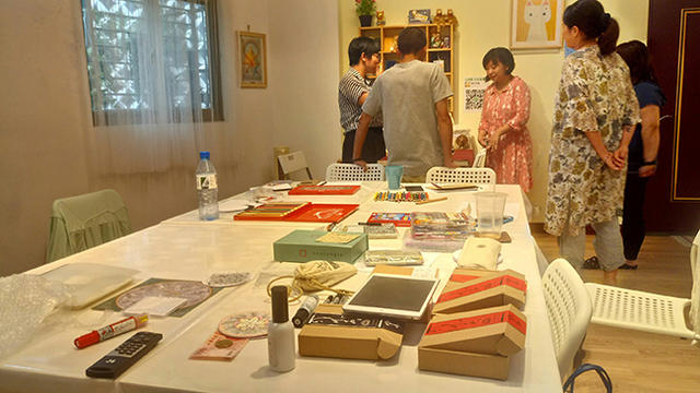 最後,Felina 在上課前提醒我們要把之前三堂的作品都帶來,這時她微笑請大家把作品攤在已經準備好的桌布上,要我們想像自己是藝術家,正在策畫一個畫展。她開放了小築現場所有擺設以及畫具給我們當作佈置,我們就認真東拿一支人造花,西拿一把色鉛筆,或是乾脆掏出身上的小玩具、配件的,左看右看這才定案,大家都一邊擺一邊微笑,一邊自嘲好假掰。
