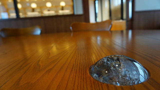 正中央以出雲勾玉為概念製作出的桌面相當引人注意,上方的照明則是以注連繩為形象的原創作品,桌子上頭還有顆非常大的白水晶,不妨輕柔地摸一摸它,相信能為你帶來不少好的緣分與運氣。