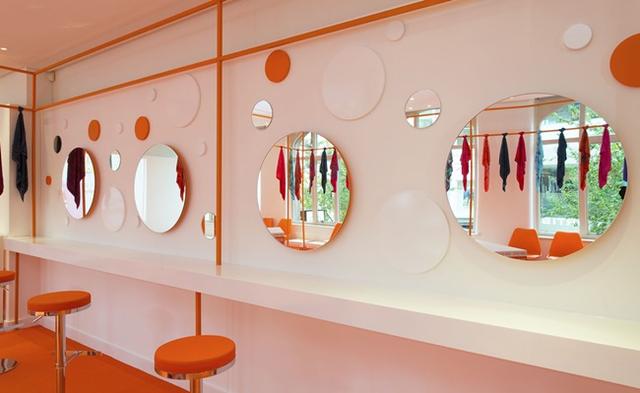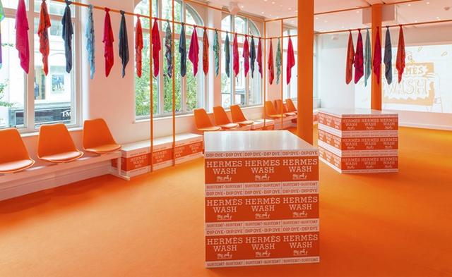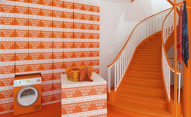 愛馬仕快閃洗衣店位於一棟兩層樓建築,一樓內有著同樣亮橘色的洗衣機,還有堆放在各處的愛馬仕牌洗衣粉,堆放成一整面牆的愛馬仕洗衣粉反而也成為特別的裝飾品。雖說是洗衣店,這家洗衣店可是只洗絲巾,畢竟絲巾是除了精品包外,愛馬仕的經典之作嘛。
