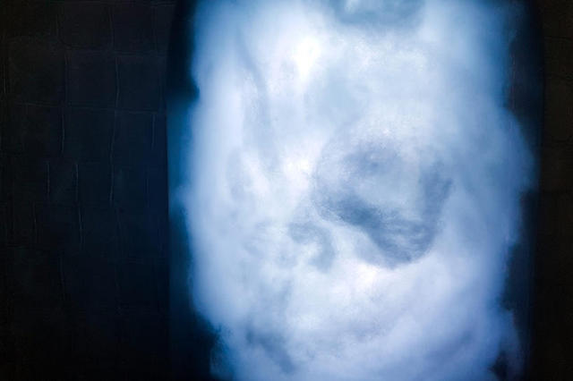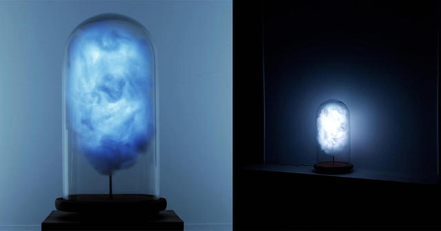 模擬雷電雲的模樣,團團棉花中包裹著藍色燈光,裝置設定追蹤川普的推特帳號,只要一有新的訊息就會閃閃發光,彷彿雷電將至的不祥氣勢,壟罩在整個玻璃罩中。