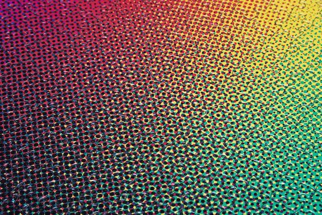 從遠處看來,「CMYK 色彩拼圖-顫動色版」彷彿沒有照著色域圖的分布,有種模糊與紛亂的感覺。定睛一看更像會流動一般,令人難以捉摸,這種亦動亦靜的迷幻風格,跳脫出既有的色彩框架!