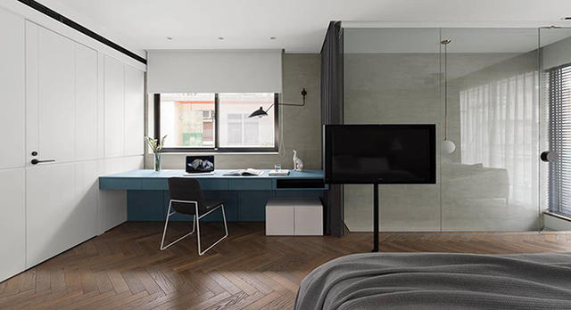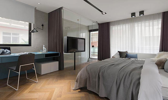 幾乎和一樓工作區域相同坪數的寬敞主臥,是設計總監私人的休憩場域,強調不需要過於裝飾的概念,甫上樓運用大面積玻璃做為隔間,創造視覺穿透效果,另外空間必備的電視則安裝鐵柱架懸掛電視,成為毫無阻擋的存在,機上盒改為紅外線操控,讓整體空間更為簡潔俐落。