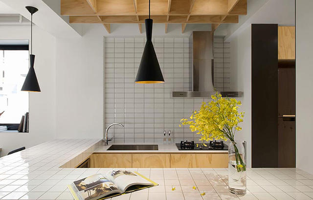 因為空間運用關係,少了餐桌規劃,直接讓吧台成為用餐區域,走入其中還以為到了哪間國外餐廳,大量以白色鐵道磚拼貼,從牆面延伸到吧台磚面,賦予簡潔俐落美感,並於天花上方加裝松木合板,格子型態的配置延伸視覺穿透降低壓迫感,木頭的色彩與 Tom Dixon 黃銅吊燈相互呼應,創造空間應有的暖意。後方黑色量體則是進入浴室空間前的牆面包裝,為了讓整體視覺更有層次,黑色板材加上沖孔鐵網設計,導入更為 Loft 的效果。