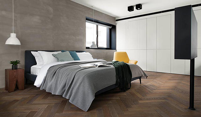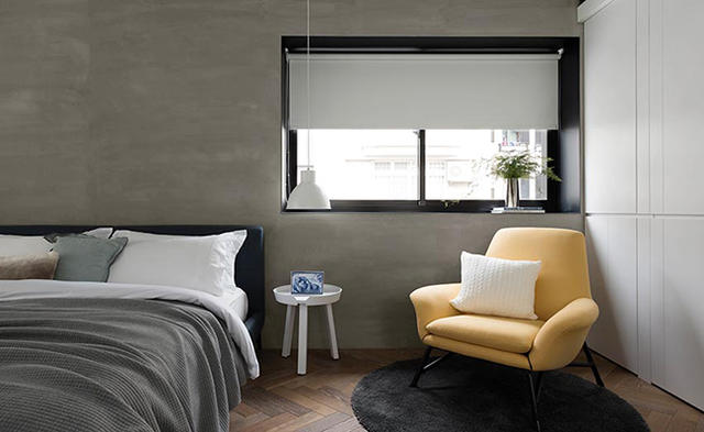 不同於牆面仿清水模塗料的粗獷感受,地板選擇自己染色的木頭材質進行人字拼貼,4-5 種色彩變化,讓空間更顯層次,再加上藍色的木作書桌、鵝黃色角落單椅,以及大面積落地窗迎向的自然景觀,增加臥室區域溫度同時,也產生略帶活潑的氛圍。