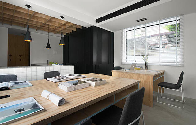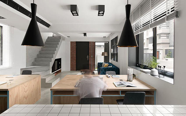 走在台中巷弄中,總是會遇到殘破不堪的老建築,早已荒廢許久乏人問津,特別偏好老舊建築的天沐設計黃正軒設計總監,從三十歲以來的願望就是找到一間老屋加以翻新,成為結合工作型態的住家。目前他正住在擁有 60 年歷史的「廢墟」中,光從改建後的外表看來完全無法想像當初景象,外部建築結構原封不動,透過再次防水與石頭漆補強,讓白色築體呈現充滿明亮的簡單特色,庭院外牆則以水泥粉光塗刷,展現質樸沒有過多裝飾的建築原味。內部則透過一、二樓區分機能使用界定,平日工作多在一樓完成,二樓就是完全隱密的私人獨享空間,維持外觀一貫的簡約 Loft 風格,黑、白、灰,加上一點木頭的溫潤感受,是工作室卻又充滿家的溫度。