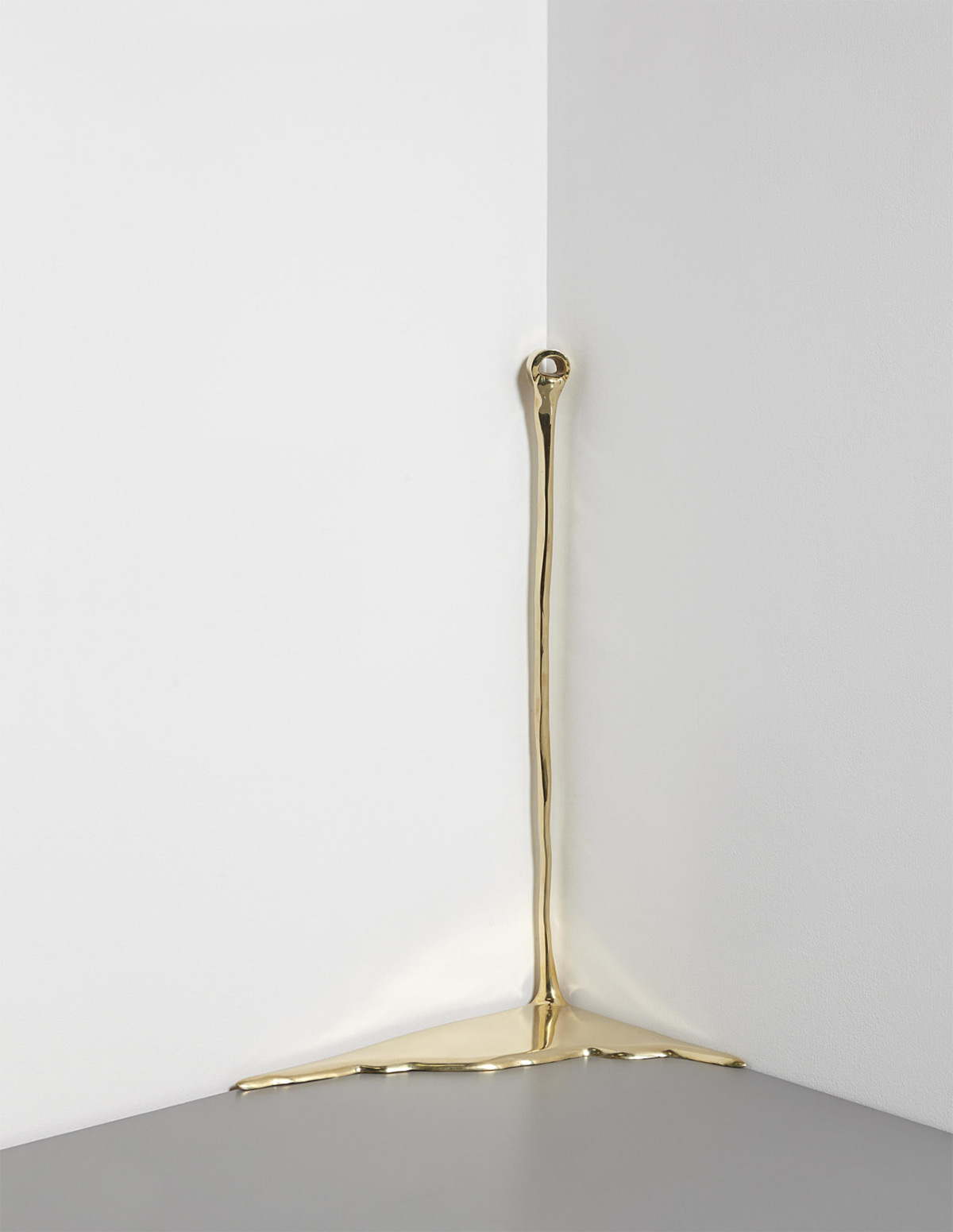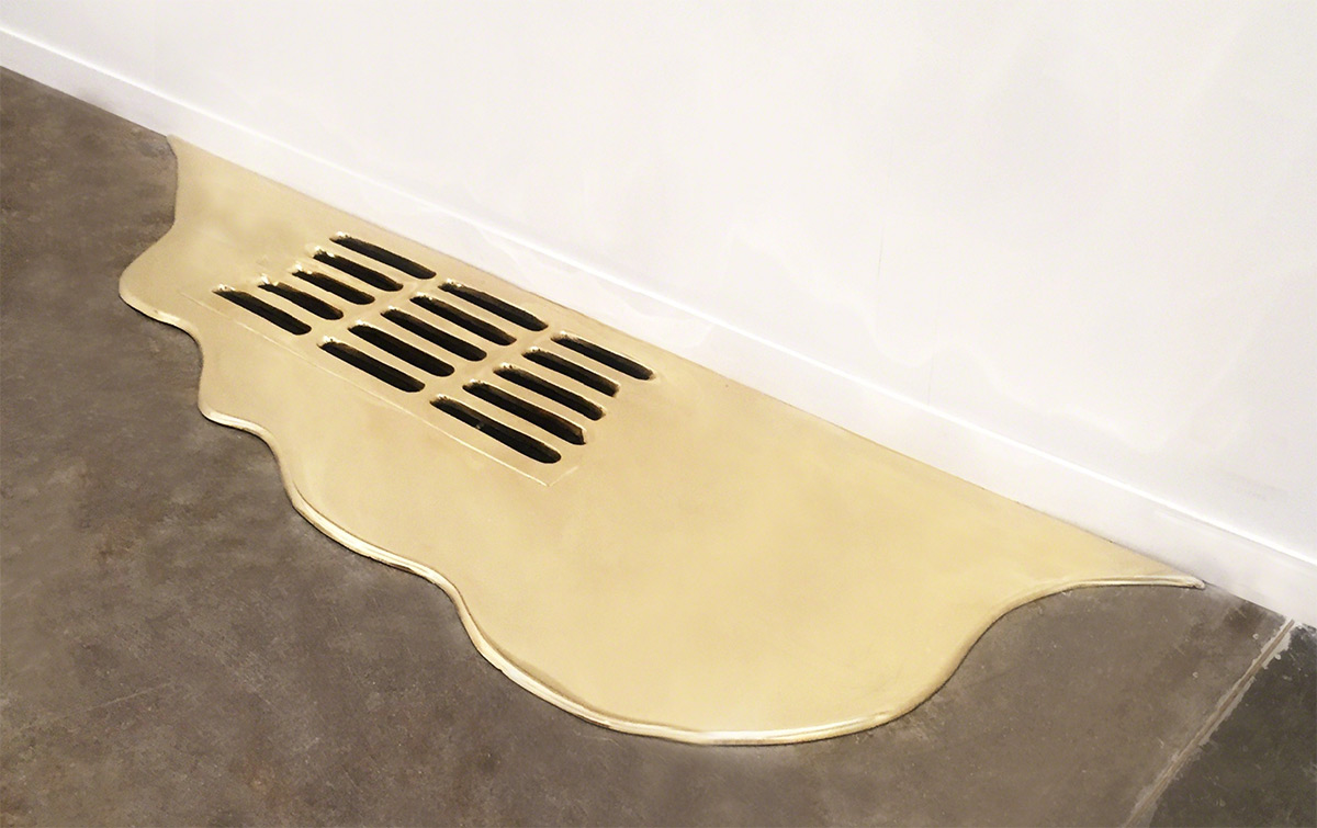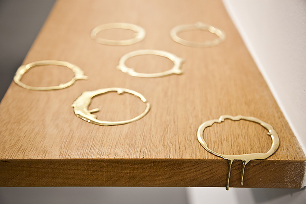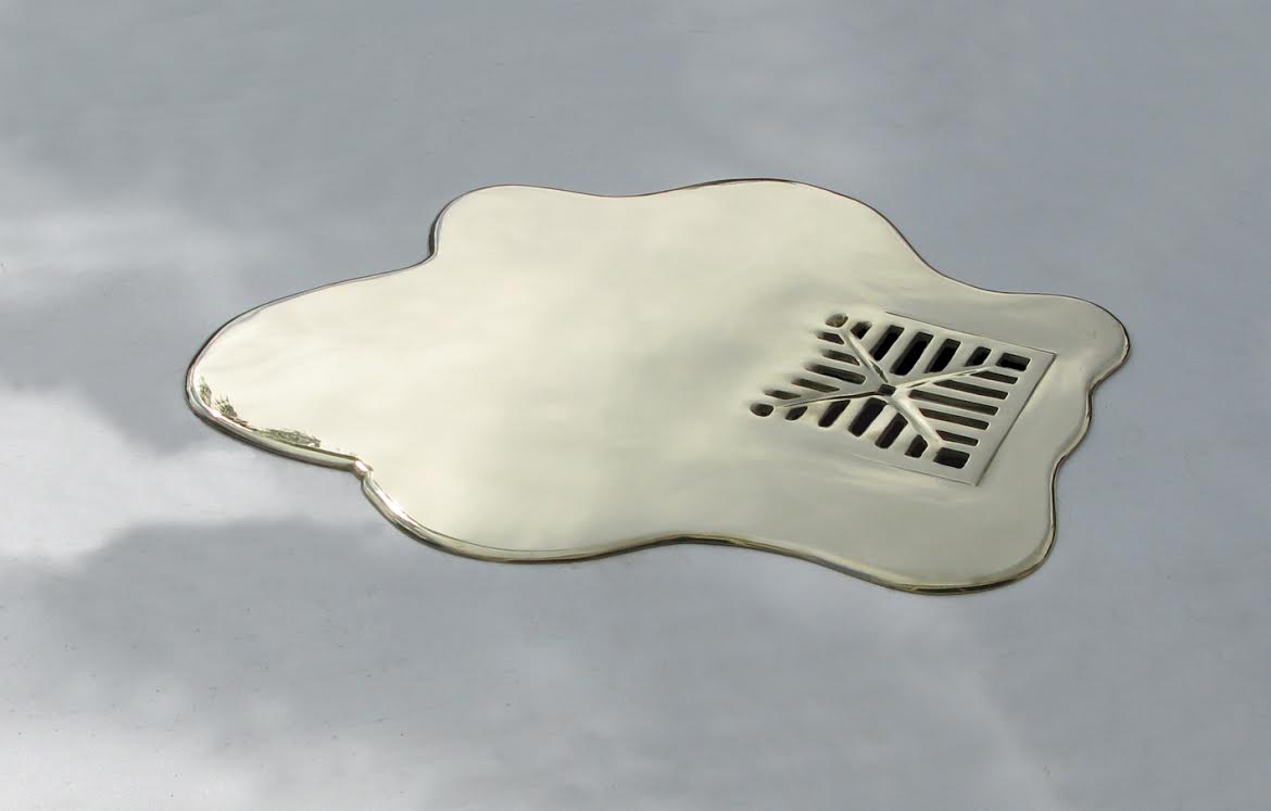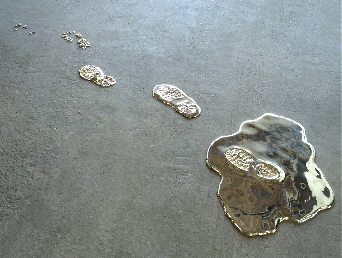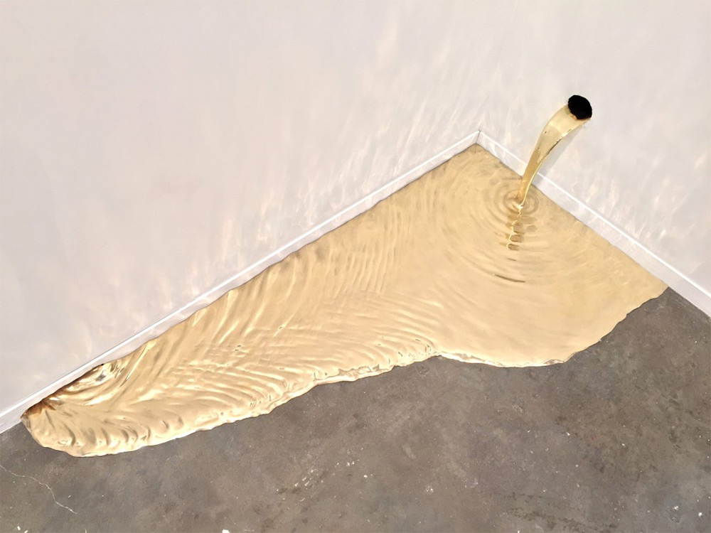 巴西藝術家 Vanderlei Lopes 的作品,向來喜歡透過固態與液態之間的轉換,彰顯出兩者之間的張力,而照片中的這系列作品,以黃銅雕塑將水以液態暫時保留,有的從牆壁上的洞汩汩流出,有的在排水孔周圍成為一攤積水,有的甚至在時間的靜置下,留下乾掉後的「黃金」腳印、杯印,成為名副其實的「流金」歲月。