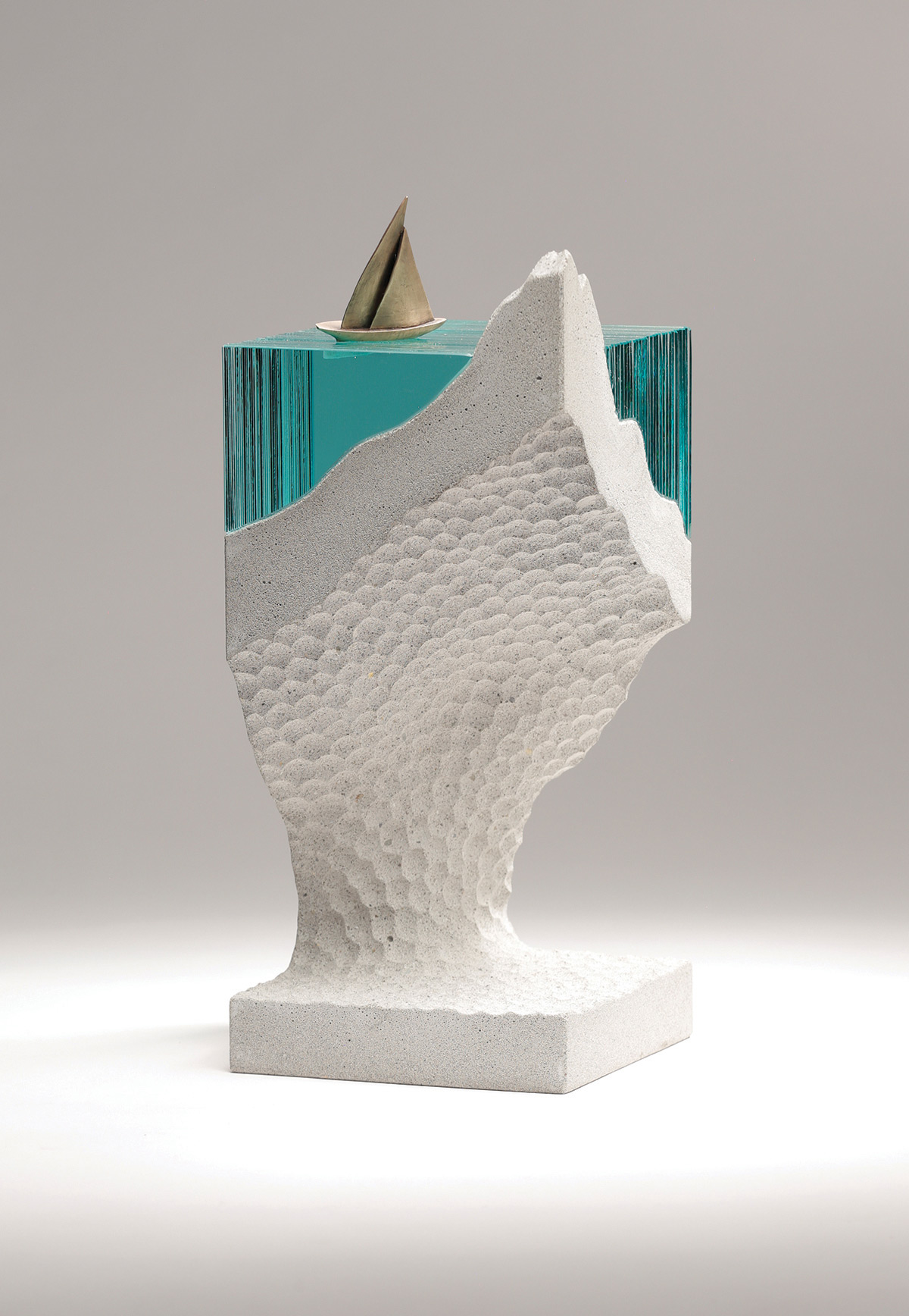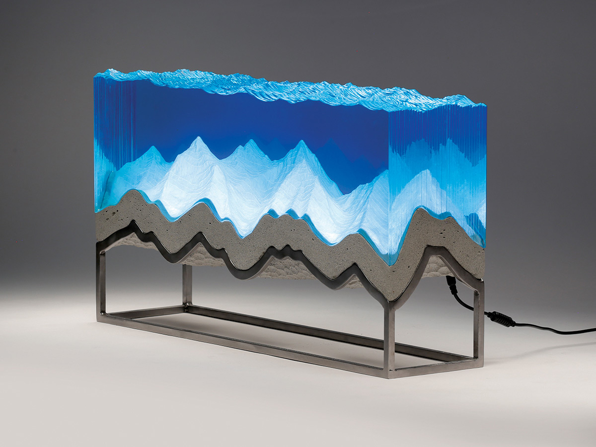 Ben Young利用手工切割一片片玻璃,模擬出澄澈的水中世界,配合混凝土打造出來的地形起伏,以及水面上金屬製的潛水者、燈塔或是帆船,將時間、空間凍結在那一剎那。