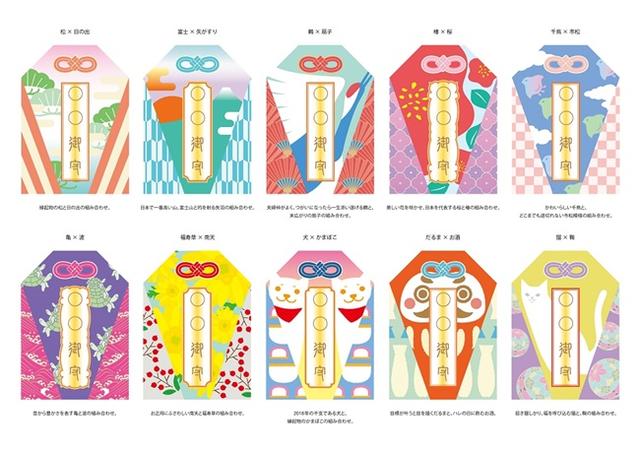 製作御守年賀卡有兩種方式,一種是使用網站原有的圖案樣式,包含「椿花 X 櫻花」、「松 X 日出」、「富士 X 箭矢」、「鶴 X 扇子」、「千鳥 X 格紋」、「烏龜 X 波浪」、「福壽草 X 南天竹」、「犬 X 魚板」、「不倒翁 X 酒」和「貓 X 鞠」10 種可以選擇。