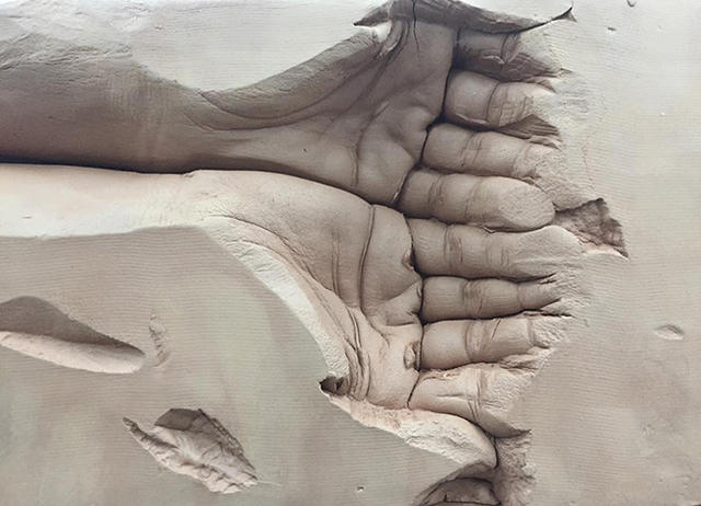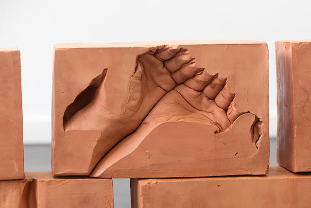 藝術家 Dan Stockholm 創作了一系列石膏雕塑「By Hand」,將自己的手掌彎曲成杯狀,融入於一塊塊紅色磚塊中,有些紅磚是雙手,有些則是手掌或手指的一部分。他的創作靈感源自於 2013 年其父死後,他用自己的手摸遍父親家的每一寸磚瓦的影片紀錄。