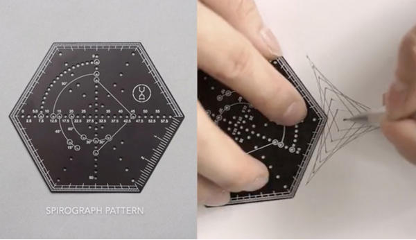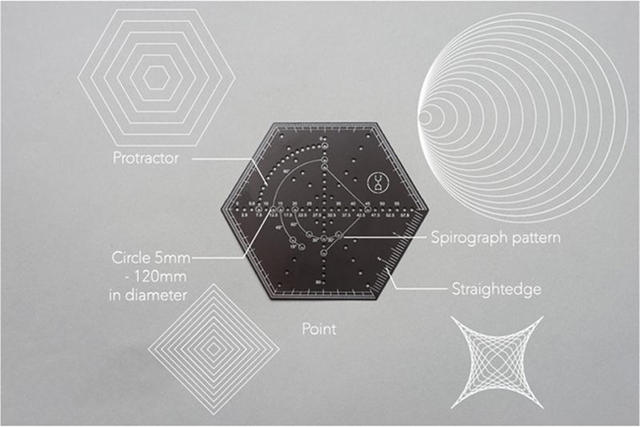 跟直線款一樣有直尺與量角器功能,但量角器部分採用更簡化的點狀標記。旁邊這些由六邊形頂點向內延伸的洞洞們,可能會讓你想起小時候玩過的彩色萬花尺⋯⋯。先以筆在紙上點出每一點的位置、再逐一由點連成線,像在玩連連看一樣,便能交織出複雜美麗的圖樣。