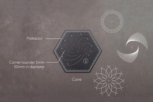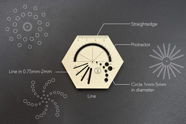 擁有基本的直尺與量角器功能,以及直徑 1 ~ 5 mm 的圓圈、粗細介於 0.75 ~ 2 mm 的線條,稍加排列組合就能設計出放射狀的圖案!