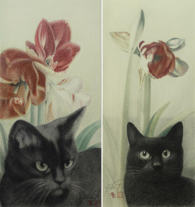 圖左至右:高橋行雄,孤挺花,彩色鉛筆、版畫紙,46 x 35cm,2016 年;孤挺花與黑貓,彩色鉛筆、版畫紙,24.5×55 cm,2015 年。圖 / 阿波羅畫廊提供。