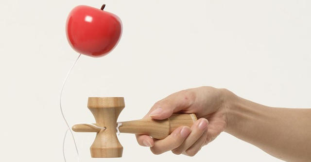 劍玉是日本傳統玩具之一,由木字石頭的「劍」和球體的「玉」用線連結組成,使用者向上拉動球體,要讓球落在劍頭或是兩旁的大、小皿,每端的難度都不同。不過 Yasuhiro Suzuki 的劍玉則是將原本的球,換成紅通通的蘋果,變成蘋果的劍玉,好像也一點也不突兀啊,更別有一番樂趣 XD。