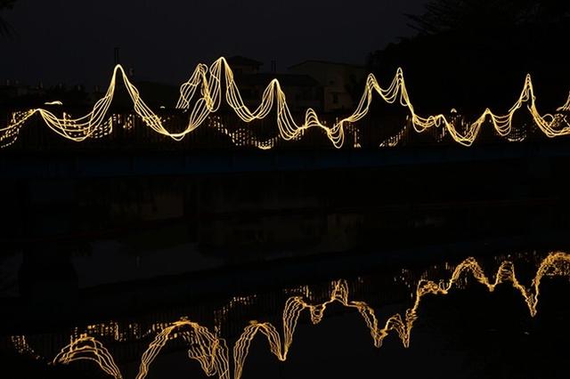 月津港燈節作品《光的織遇》,陳冠宏x陳思涵創作。作品利用軟性可曲折的環光燈條,編織出光的流動身影,定格出律動的光線,交織在曲橋的兩側;置身其中,能夠感受到由光的線與面所構成的光織場域。當夜色降臨,人們遠眺曲橋時,光線將織譜出視覺的浪漫樂章,與觀者相約在夢幻的光景中。