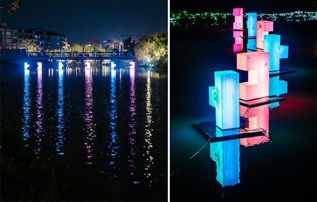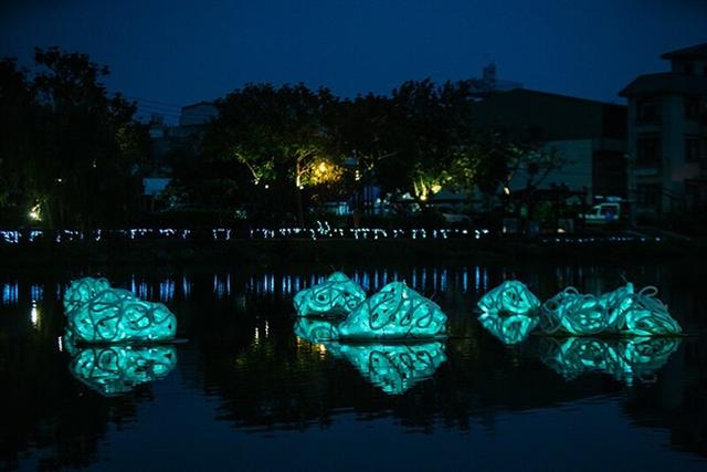 月津港燈節作品《光雲》,創作者蘇小夢。有如雲朵或花卉的〈光雲〉,在靠近曲橋的河中映射出自己的倒影,鏡花水月的詩意風景,讓每位相約在此的舊識,或是相逢邂逅的新知,都能眺望到這片浪漫美麗的光影風景,並在記憶中留下深刻的視覺印象。