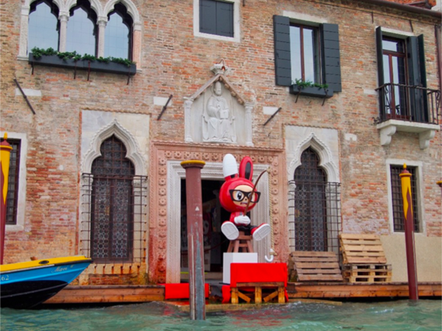 動漫美學藝術家不二良,同時也是潮牌STAY REAL設計師,以「姜太公釣魚,願者上鉤」為發想,創作五公尺高《釣魚小兔》此作品的縮小版也曾在威尼斯展出