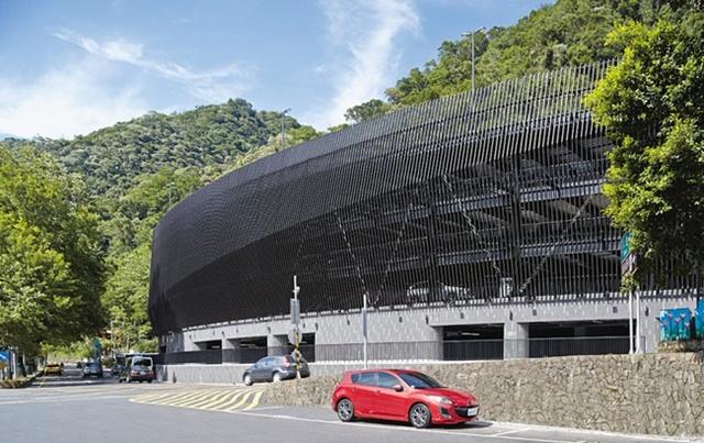 Q-LAB 建築事務所以烏來山景的峰陵線為靈感,打造了一座隱於山間停車場建築。在環狀的建築外觀上,建築團隊利用線型格柵圍塑出如雕塑般的立面,除了以抽象化的方式展現部落的編織工藝,也創造出通風、阻擋西曬的機能。