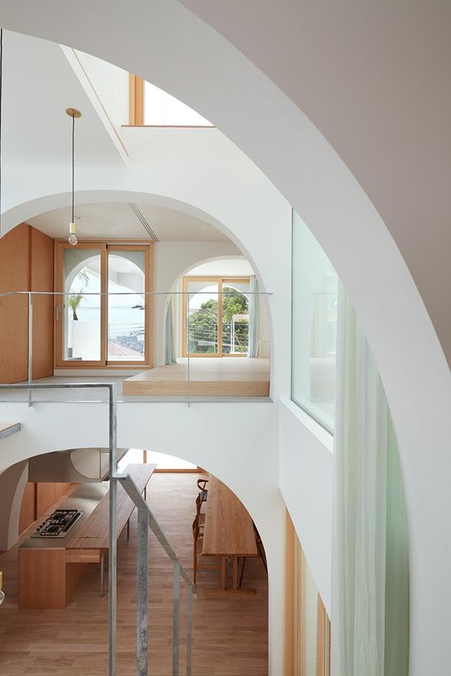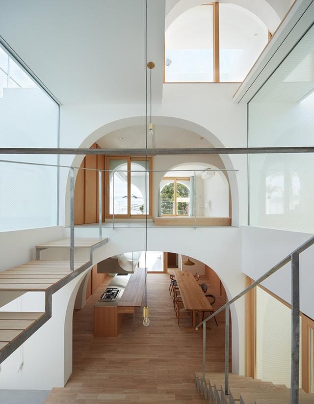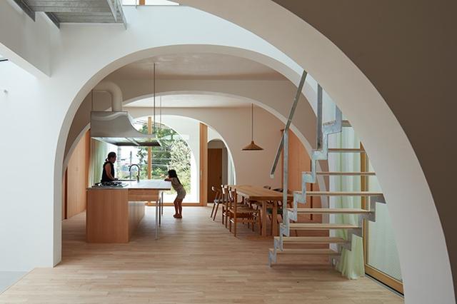 這位日本建築師在中世紀教堂羅馬式立面的基礎上設計出了獨特的模組系統。住宅中使用了一系列拱門結構,幾乎形成了類似飛拱的形式,這樣的設計為空間增加了開闊感,同時將更大量的自然光引入室內。住宅多層拱門的設計讓建築師可以進行 “自由空間堆疊” 。在住宅的多個樓層之間行進能夠感受到很強的互動性,每個樓層都使用了充滿趣味的有機形狀,並按照全面的方式組合在一起。