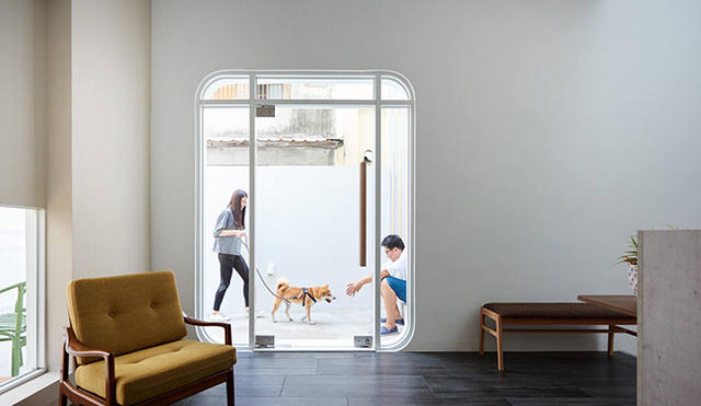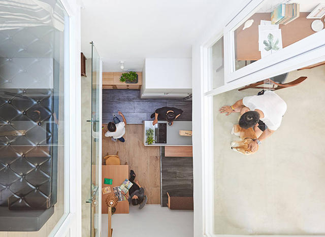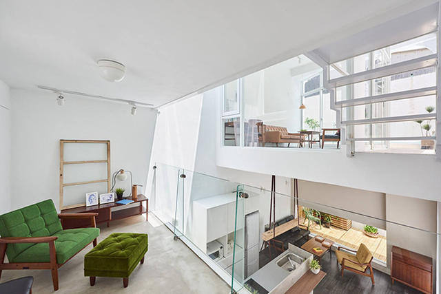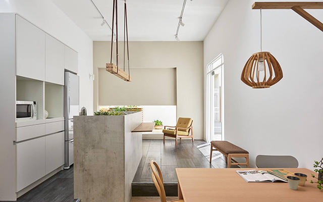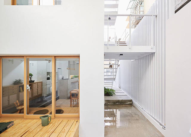 為了增加陽光的穿透,設計團隊拆掉房子原有的鐵皮跟鐵窗,保留立面、錯位樓層的基本結構,把白色、簍空搭配木頭踏板的樓梯移到室外,並採用大片的玻璃窗以及天井,讓整體空間不僅明亮,還能在視覺上擁有遼闊的感受,不會被限制於一隅。