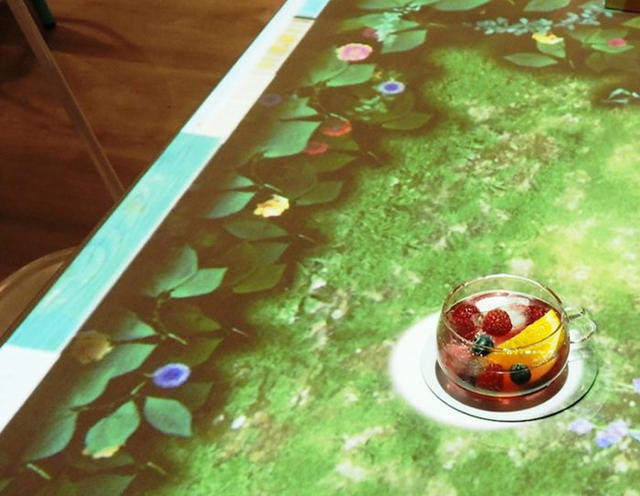 目前第一彈共推出了三款飲料,每一款會搭配不同的影像主題。像上圖這款「宇宙散步(宇宙さんぽ)」,就是以星空為主題,搭配上以藍色為基底的飲料以及在杯口飄浮著的雲朵,有如進行一場宇宙探索之旅。而且這不單單只是把宇宙影像投影於桌面而已,當你喝著飲料的同時,還可以不時地觸碰桌面,也會有一些互動的影像變化喔!