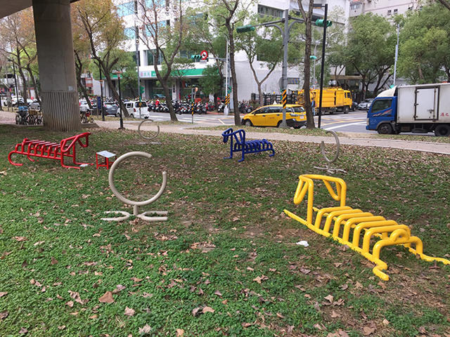 PiliWu Design 吳孝儒在捷運劍潭站 2 號出口南側線性公園,因應周遭大多為飼養寵物的居民,建置寵物友善裝置「旺旺來」。