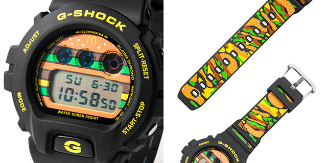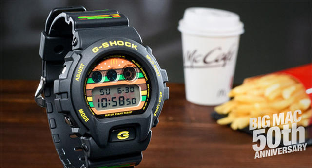 G-Shock 聯名手錶則是適逢日本卡西歐旗下的品牌 G-Shock 成立 35 周年,與麥當勞攜手打造大麥克手錶,錶帶上充滿紅、黃、綠等漢堡色彩元素,錶面就是一個大麥克漢堡,手錶的背面則刻上「BIG MAC 50th」的字樣,比起戴它出門,鮮豔、豐富的色彩更適合收藏。
