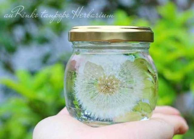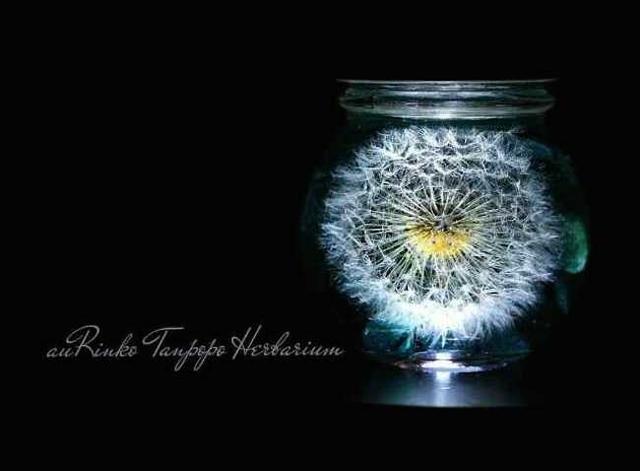 經過乾燥處理的蒲公英,放在裝有特殊液體的玻璃罐中,成了惹人憐愛的浮游花,特別是蒲公英傘上看起來非常鬆軟的絨毛,精緻又可愛,令人愛不釋手。到了夜晚,點上燈後,經過光的折射,罐中漂浮著的蒲公英,除了看起來更大、更加閃閃發光,還增添些許神秘氣氛,與白天總是充滿陽光、帶著希望的正向風格相比,又是另一種完全不同的味道,但同樣受人喜愛。