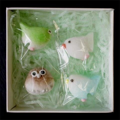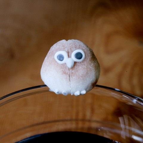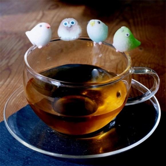 做成杯緣子大小的文鳥、貓頭鷹等其實是可以加入茶或咖啡中融化使用的糖塊。