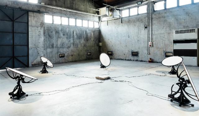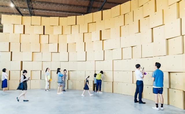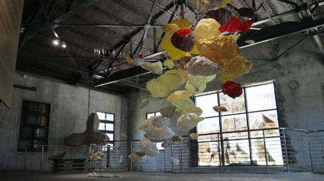 專注聲音藝術的吳秉聖,這次的作品「何處」以輕薄的宣紙挑戰紙做為發聲體的可能,五個彷彿小型衛星天線的裝置在充滿歷史痕跡的廠房裡擺動,創造奇異的感官體驗。瑞士藝術家 Zimoun 同樣以聽覺為徑,在挑高的展場中以棉球動力裝置敲打 180 個紙箱,堆疊成牆的紙箱隔絕出一方獨立空間,從「牆」外就先帶來視覺上的衝擊;進入牆內空間後,重複的敲打聲如同無形的膜一樣讓人與現實暫時斷線,全心體會每一個紙箱的不同頻率。