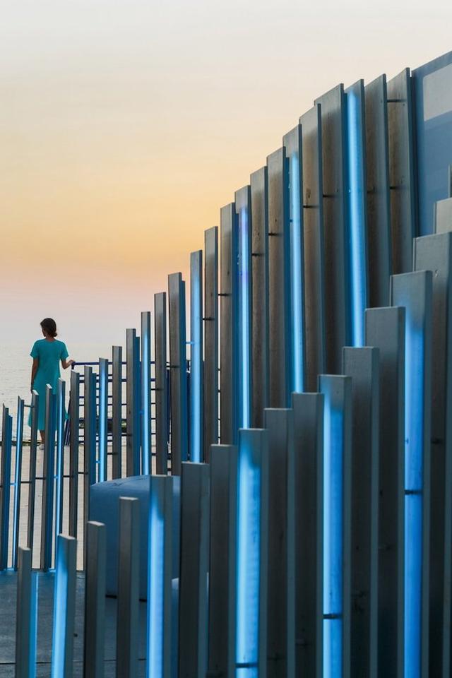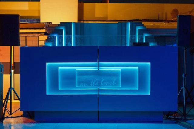 這一名為「 Fleeting Hearts – Decks on The Beach(飛逝之心——海灘露台)」的作品出自來自黎巴嫩和波蘭的一對建築師姐妹 Tessa Sakhi 與 Tara Sakhi 之手,她們利用三個可移動結構整合了整個空間,三個結構分別是 DJ 台、舞池以及總長 12 米面向大海的長吧檯。