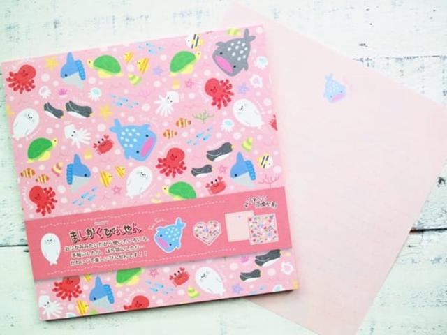像摺紙一樣的正方形色紙,表層全部都印有圖樣,裏層與設計成可以當作信紙的樣。