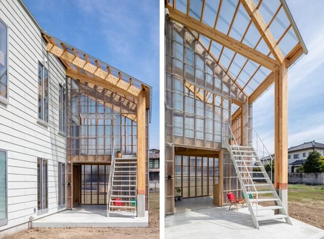 若想引日光、綠意入室,通透材質肯定是絕佳首選!由日本建築設計師 SNARK 與 OUVI 的合作案例,保留斜切長型格局,採用格狀木質結構與通透玻璃拓展獨立溫室。屋頂與立面皆由玻璃建構築起,導入充沛日光之餘,也使空氣與景觀流動於生活中,不僅多了銜接室內的玄關,更將二樓佈置為觀景休憩間,使錯落有致的木結構,清楚勾勒出日常起居動線。