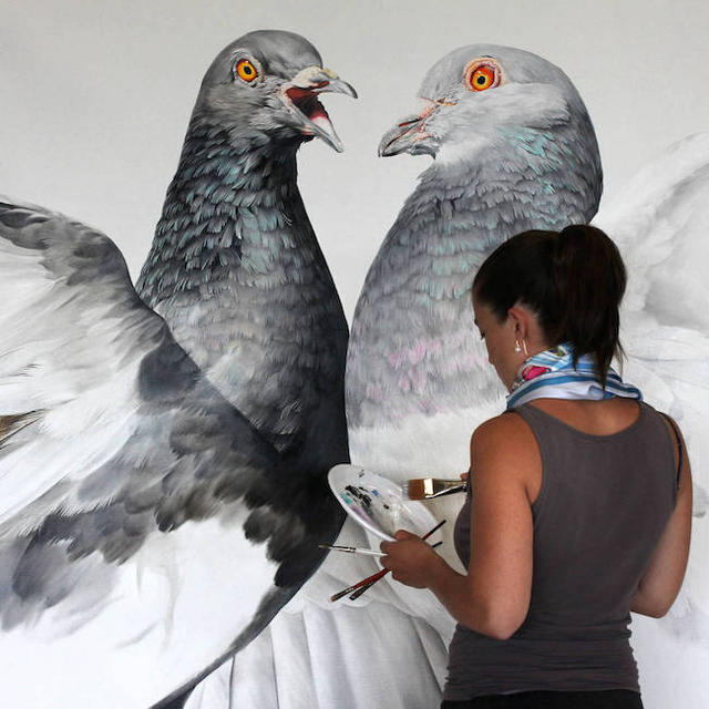 走在外國街頭,隨處可見四處覓食的鴿子,有時甚至還會遇到完全不怕人、跑來搶人食物的嘴饞鴿,藝術家 Adele Renault 以其深厚的繪畫功力,記錄了鴿子的各種姿態,小則成為帆布畫作,大則成為建築物上的壁畫,成為另一種與鴿子有關的城市街景。
